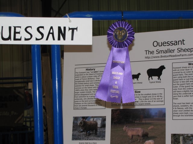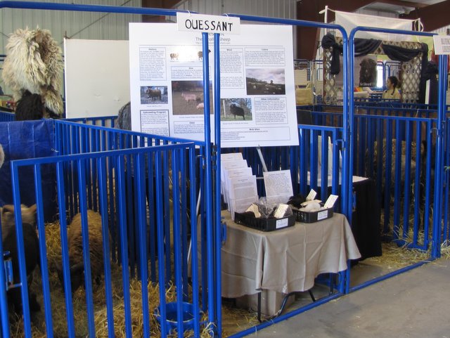 The next day, Friday, we set up our display. Being newbies at this sheep show thing, we were amazed at how well prepared others around us were and at how many things we had overlooked for our display. But, a trip to the nearest Staples provided help in organizing our handouts and other aspects of what we wanted visitors to see and learn. Our efforts led to winning a Champion ribbon for the minor breeds segment of the breed display.