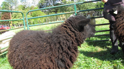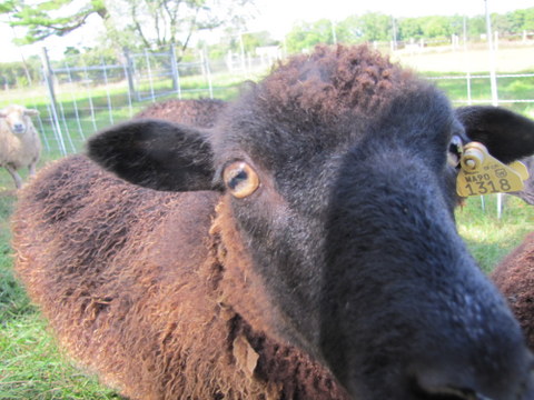 Most of our sheep or like the sheep in the foreground — a very dark brown (called black) with darker faces. Some are white like the sheep in the background often with light tan coloring on their face and legs.