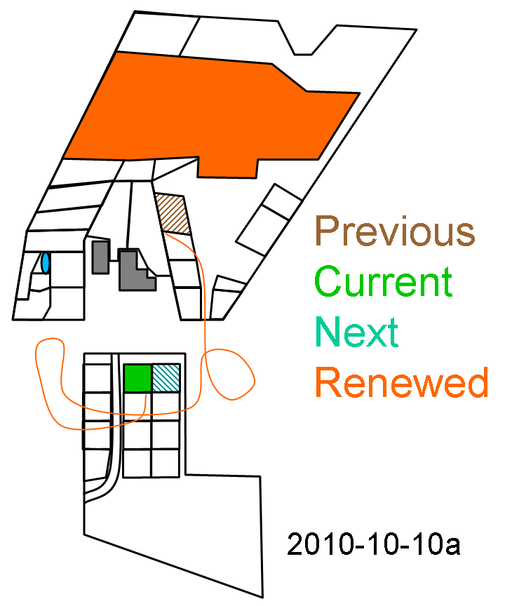 After a few more similar excursions, four of the sheep finally got the idea that they should enter the new area. That got the attention of the remainder who headed for the opening as well. A couple of sheep left the enclosure to greet the latecomers, but eventually all ended up inside. The opening was closed and that was done.